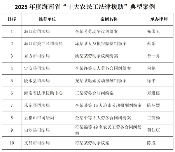 这些入选案例多数案情复杂、取证难度大、涉及人数较多。法律援助律师团队秉持专业、高效、便民原则,精准运用法律手段,依法为受援农民工挽回经济损失、维护合法权益,充分展现了海南法律援助队伍的专业素养与服务水平。
