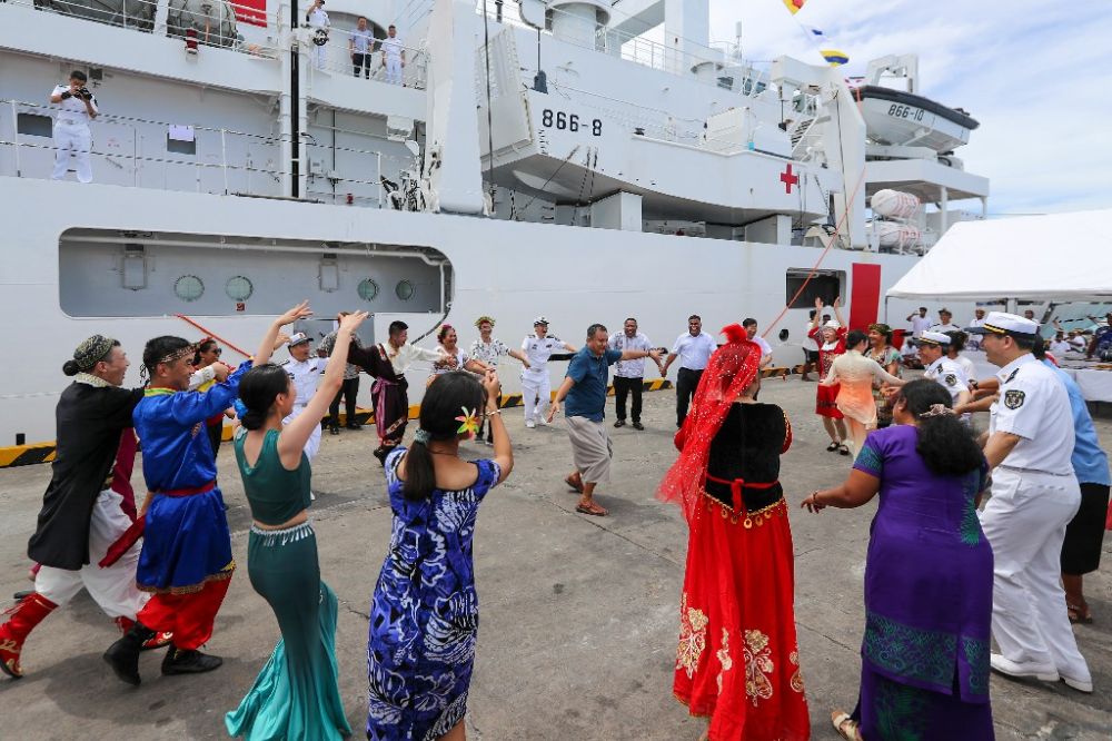 7月15日,基里巴斯首都塔拉瓦,码头上一片欢歌笑语。对于首次到访的中国海军“和平方舟”号医院船,当地民众由衷的欢迎与感激溢于言表。