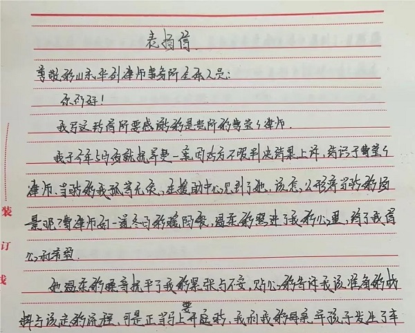 “当时的我孤苦无依,在援助中心见到了她…像一道冬日的暖阳般,温柔的照进了我心里,给了我信心和希望…让我在炎凉的生命中得到了一丝慰藉…为这世间的弱者平添了几许底气”。近日,法律援助律师曹莹莹收到了来自受援人胡女士送来的手写信和锦旗,字里行间表达了对援助律师的感激之情和法律援助工作的高度认可。
