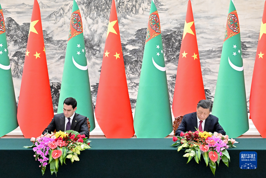 1月6日,国家主席习近平在北京人民大会堂同来华进行国事访问的土库曼斯坦总统谢尔达尔·别尔德穆哈梅多夫举行会谈。这是会谈后,两国元首签署并发表《中华人民共和国和土库曼斯坦联合声明》。