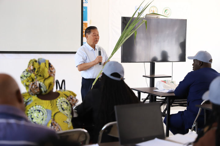 2024年8月4日,在位于卢旺达南方省胡耶区的中国援卢农业技术示范中心,菌草发明人林占熺为培训班学员讲解菌草技术。新华社发(黄万晴摄)