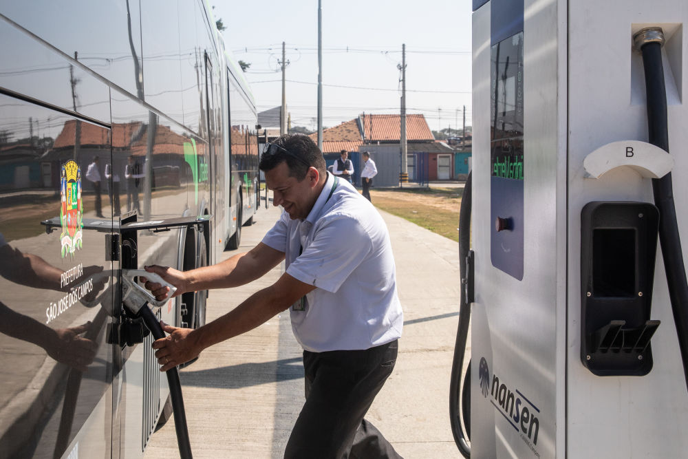 2021年11月,12台中国制造的纯电动铰链式大巴在巴西航天城——圣若泽杜斯坎普斯纯电快速公交系统投用。这是2023年7月12日,工作人员为中国制造的纯电动大巴充电。