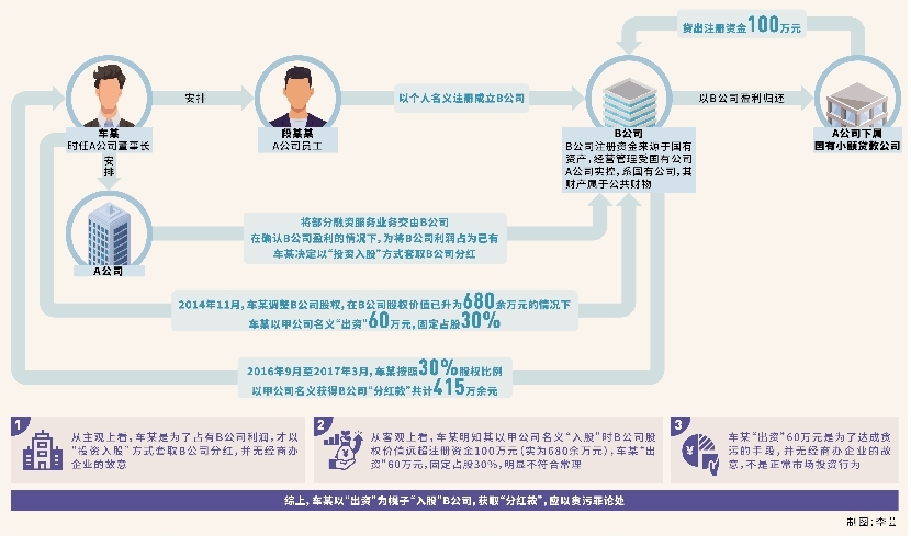 第二,车某的所谓出资行为并非市场投资行为,而是其利用职务便利获取本属于国有公司B公司的确定性预期收益的犯罪手段。本案中,车某明知其以甲公司名义“入股”时,B公司实际资产高于注册资金100万元。经查,在车某以甲公司名义“入股”B公司时,B公司实际股权价值为680余万元,车某“出资”60万元占股30%,明显不符合常理,换言之,车某“出资”60万元不应获得30%股权。车某的真实目的是在不承担市场风险的前提下,利用担任A公司董事长的职务便利,将A公司确定能够盈利的融资业务交给B公司经营,并在确认B公司能够盈利的情况下,以“出资”为幌子“入股”B公司,获取“分红款”,应以贪污罪论处。