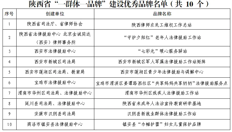 近日,陕西省司法厅发布全省法律援助“一群体一品牌”建设优秀品牌名单,陕西律师农民工维权工作总站、西安市“七彩光”暖心驿站、汉阴县新就业群体法律援助工作站等10个品牌入选。