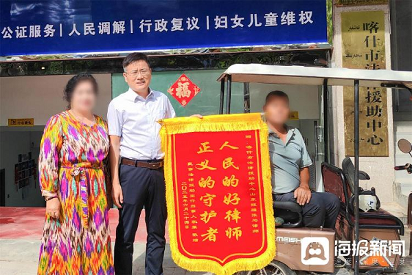 行动不便的受援人向张为律师赠送锦旗。