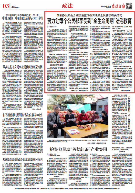 “坚持以习近平法治思想为引领,深入贯彻落实党中央决策部署,新时代新征程全民普法工作全面创新发展,全社会法治观念明显增强,全民法治素养明显提升,社会治理法治化水平显著提高,全面依法治国的社会基础不断夯实。”胡卫列在介绍情况时表示,作为法治宣传教育的主管部门,司法部将深入贯彻实施法治宣传教育法,推动法治成为社会共识和基本准则,为以中国式现代化全面推进强国建设、民族复兴伟业营造良好法治环境。