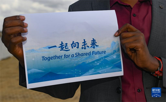 1月17日,在肯尼亚首都内罗毕,内罗毕大学教师彼得·吉科尼奥手举“一起向未来”的主题口号,祝福北京冬奥会。