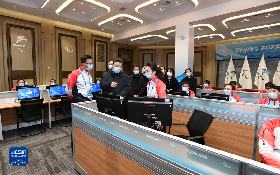 1月4日,中共中央总书记、国家主席、中央军委主席习近平在北京考察2022年冬奥会、冬残奥会筹办备赛工作。这是4日上午,习近平在北京冬奥会、冬残奥会主媒体中心主新闻发布厅考察。新华社记者 谢环驰 摄