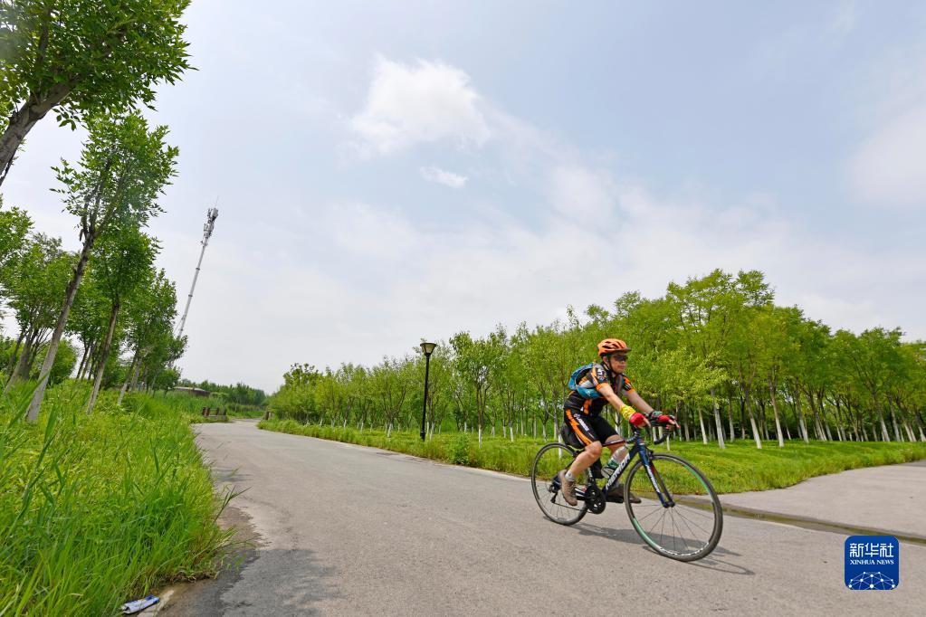 游客在天津市津南区绿色生态屏障辛庄湾内骑行(7月10日摄)。 新华社记者赵子硕摄