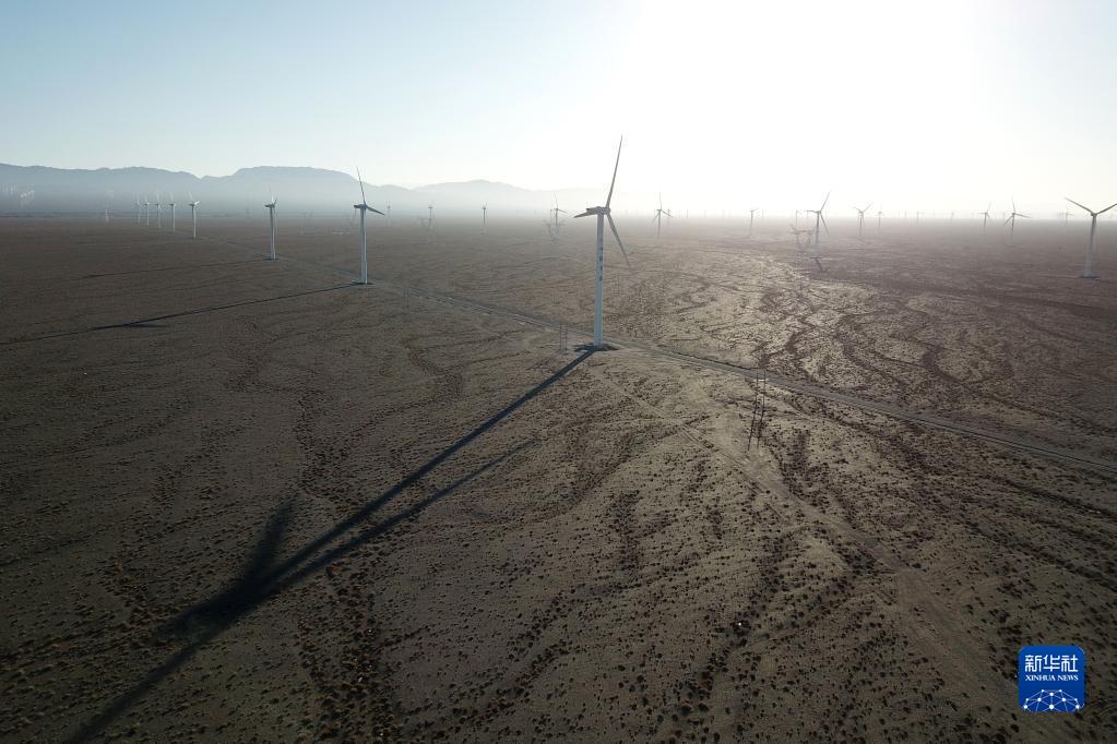 这是2021年12月8日拍摄的中节能(甘肃)风力发电有限公司玉门昌马风电场的风机(无人机照片)。新华社记者 范培珅 摄
