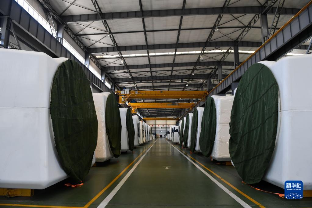 这是在内蒙古鄂尔多斯市一家能源装备有限公司生产车间拍摄的准备出售的风电机(2018年4月18日摄)。新华社记者 刘磊 摄