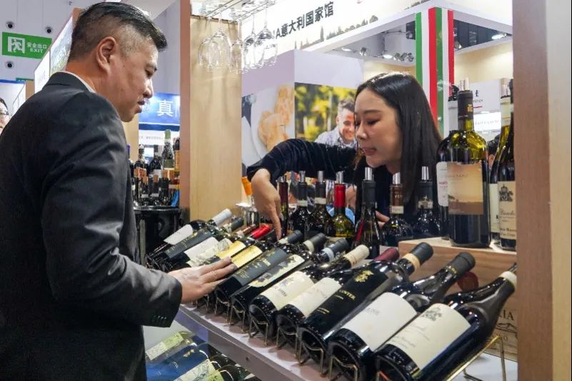 2024年3月20日,在第110届全国糖酒商品交易会中国西部国际博览城展馆内,参展商向客户介绍进口红酒。新华社记者 唐文豪 摄