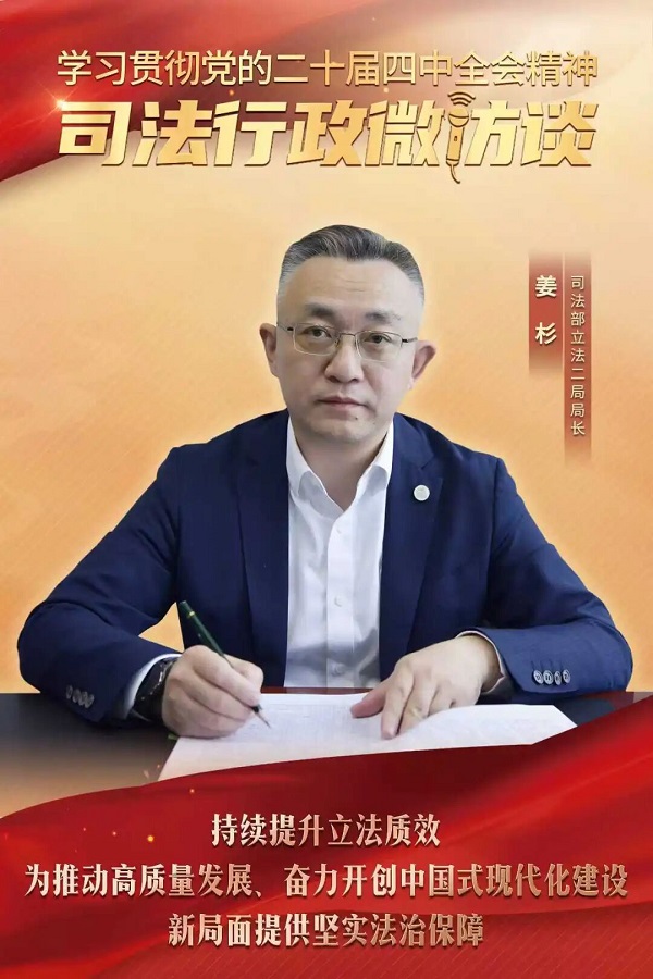 为做好党的二十届四中全会精神学习宣传贯彻工作,及时反映司法行政系统学习贯彻全会精神、推进工作发展的体会收获和具体举措,形成学习贯彻的良好氛围,我们策划推出“学习贯彻党的二十届四中全会精神——司法行政微访谈”节目,今天邀请到的访谈嘉宾是司法部立法二局局长姜杉。