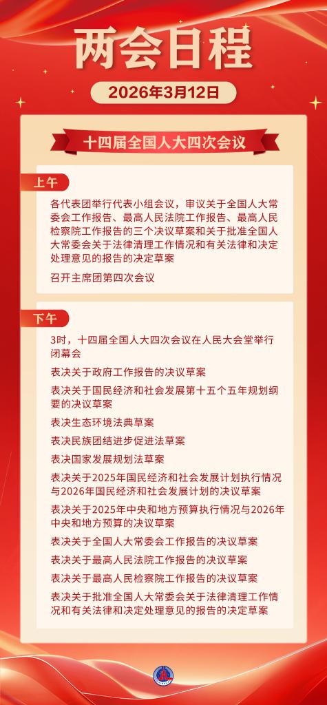 两会日程预告丨3月12日:十四届全国人大四次会议闭幕