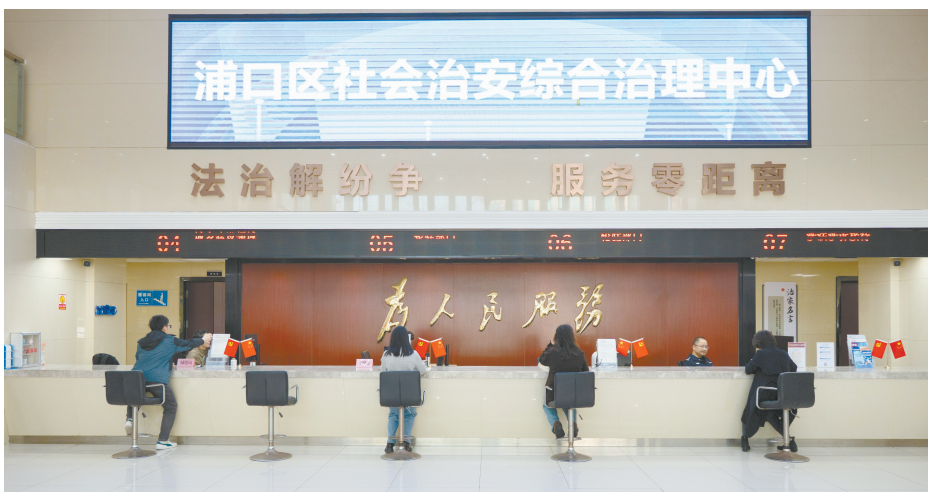 图为江苏省南京市浦口区社会治安综合治理中心工作人员有序接待办事群众。