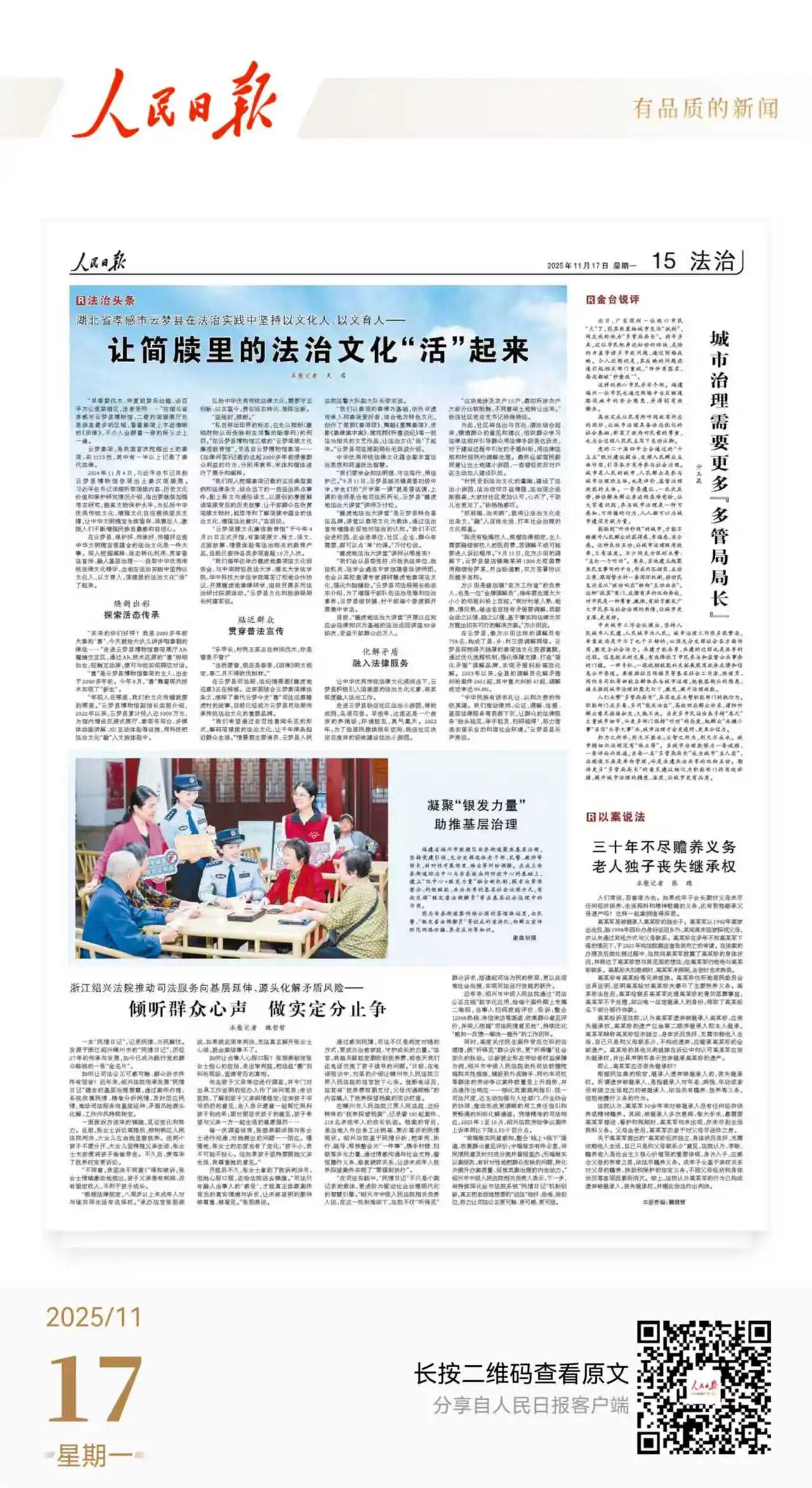 “中华民族有讲求礼让、以和为贵的传统美德。我们推动律师、公证、调解、法援、基层法律服务等资源下沉,让群众的法律服务‘抬头能见、举手能及、扫码能得’,努力营造安居乐业的和谐社会环境。”云梦县县长尹亮说。