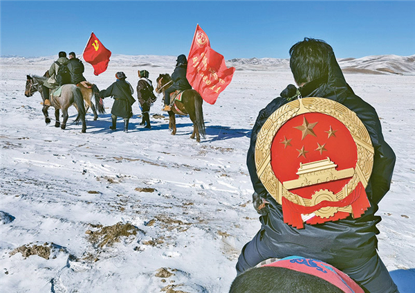 青海省果洛藏族自治州玛多县平均海拔4500米以上,人口居住分散,交通十分不便。为让群众少跑腿,法院工作人员骑马下乡入村,把法庭“搬”到牧民的帐篷前,及时受理与群众生产生活相关案件,实行就地立案、就地审理的方式,方便群众诉讼。图为2021年12月20日,玛多县人民法院的“马背法庭”成员在下乡途中。 新华社记者 柳泽兴/摄