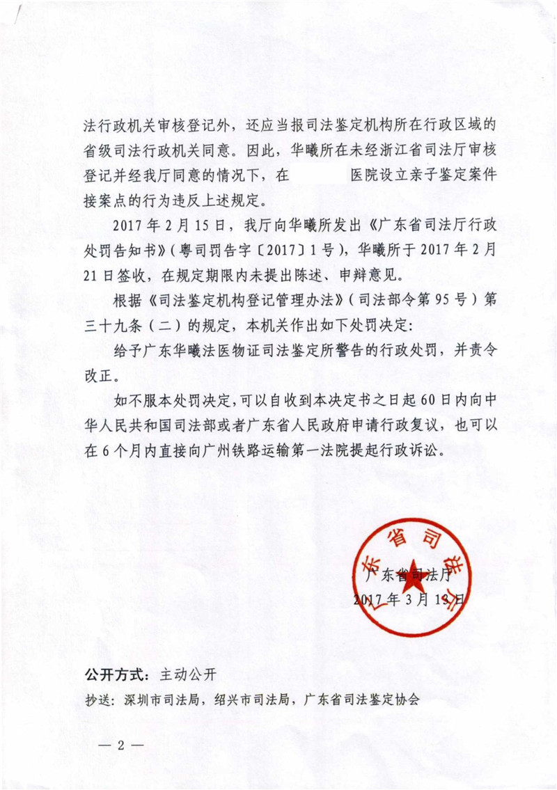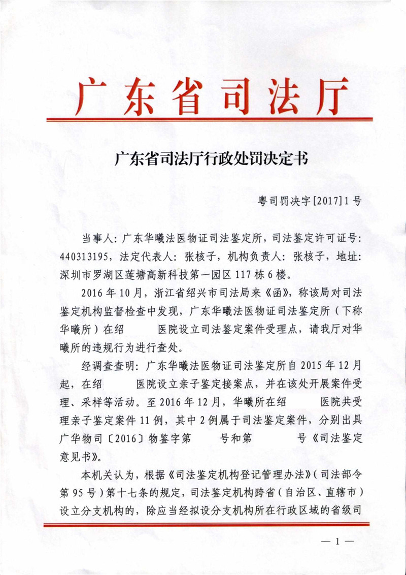 广东华曦法医物证司法鉴定所因违规设立分支机构受警告处罚