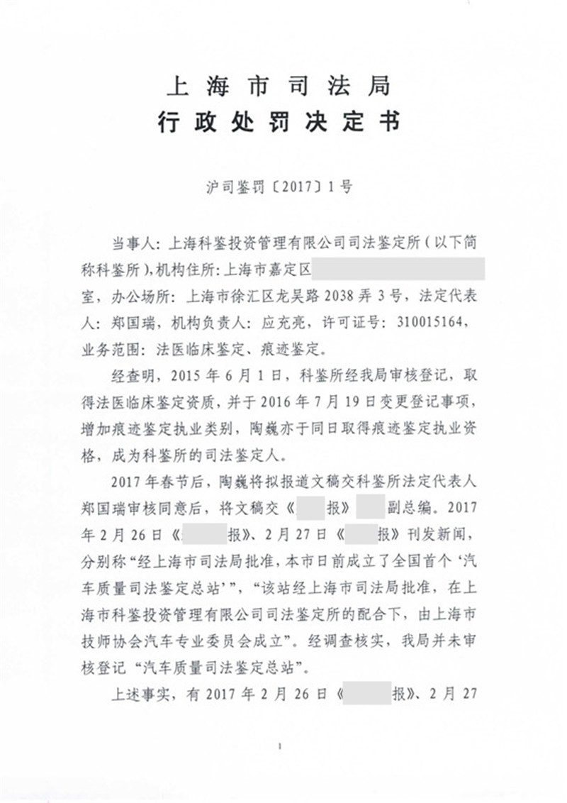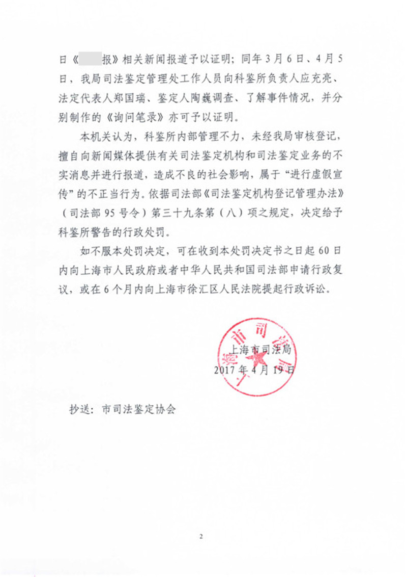 上海科鉴投资管理有限公司司法鉴定所因虚假宣传受警告处罚