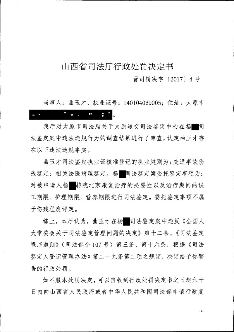 山西鉴定人曲玉才因超范围执业受警告处罚