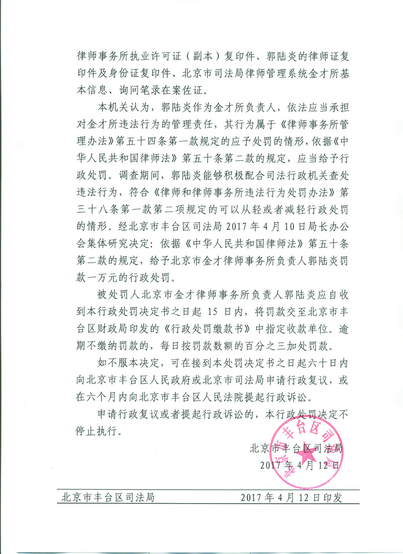 北京市金才律师事务所负责人郭陆炎因对本所疏于管理被罚款一万元
