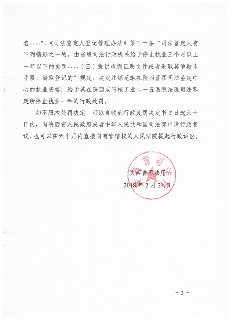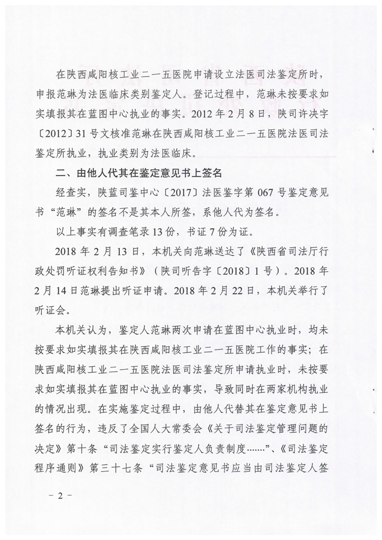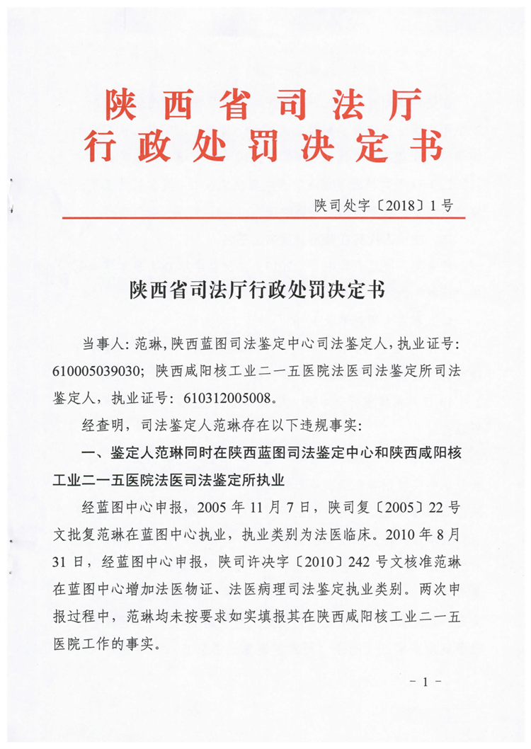 陕西鉴定人范琳因同时在两家鉴定机构执业、由他人代签名、骗取登记受停止执业一年处罚