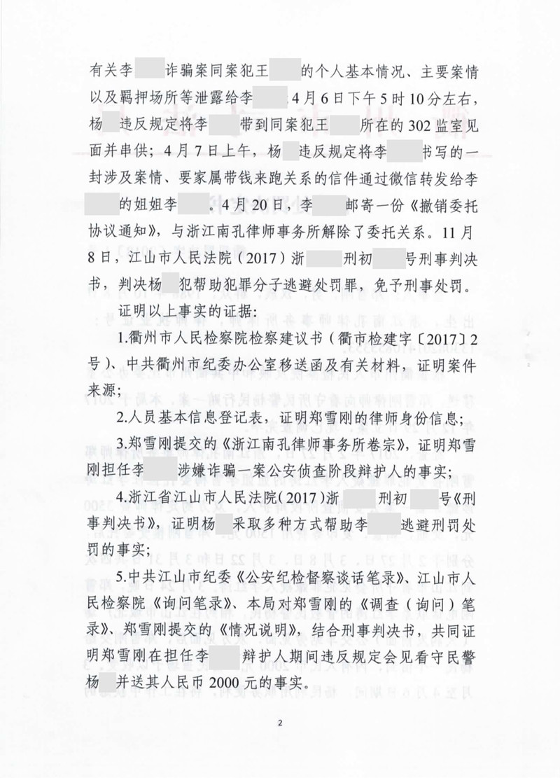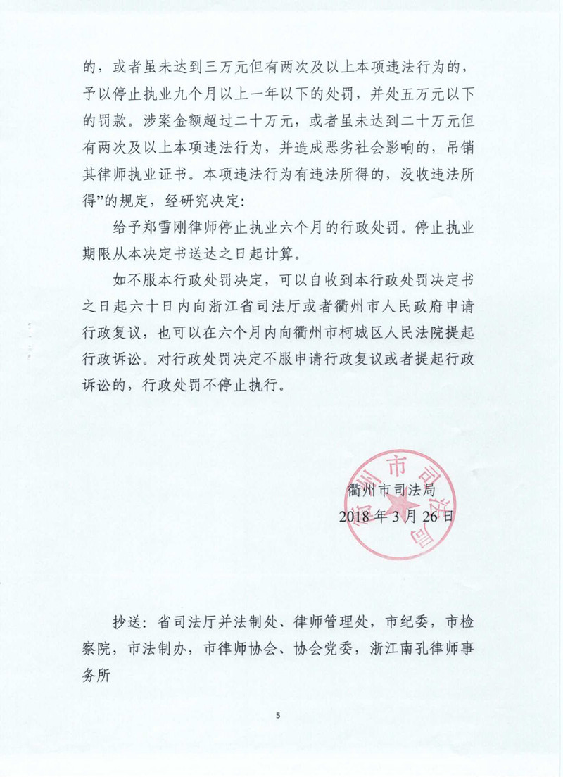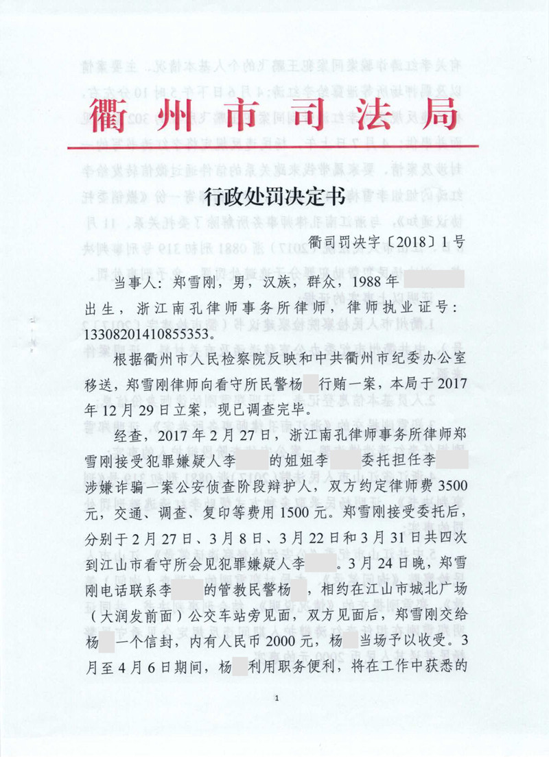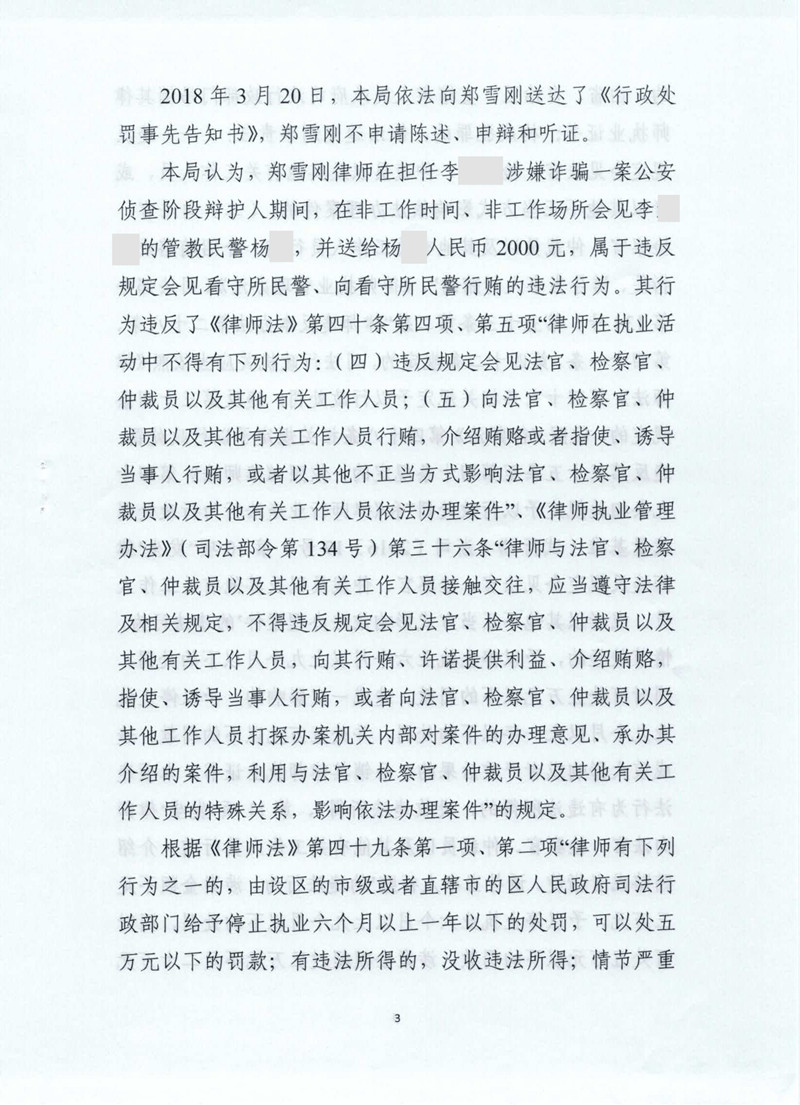 浙江郑雪刚律师因违规会见其他工作人员、行贿被处停止执业6个月