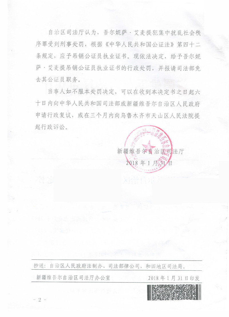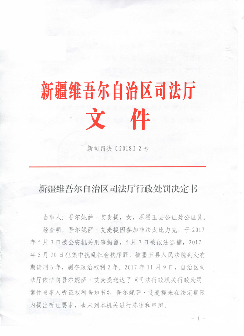 公证员吾尔妮萨·艾麦提因犯集中扰乱社会秩序罪处吊销执业证书处罚