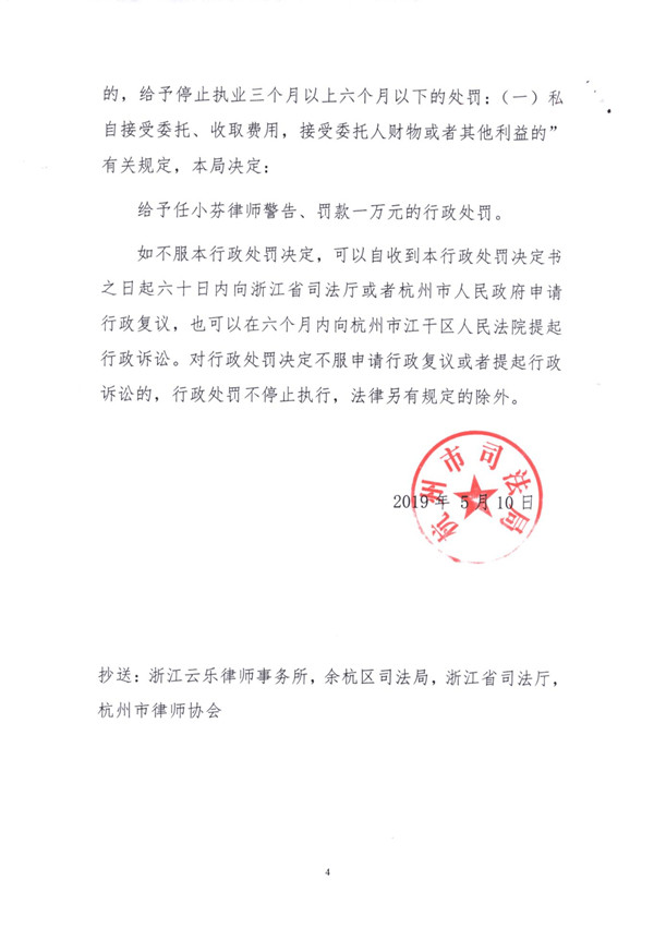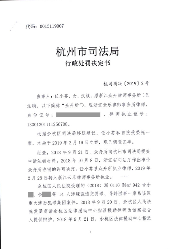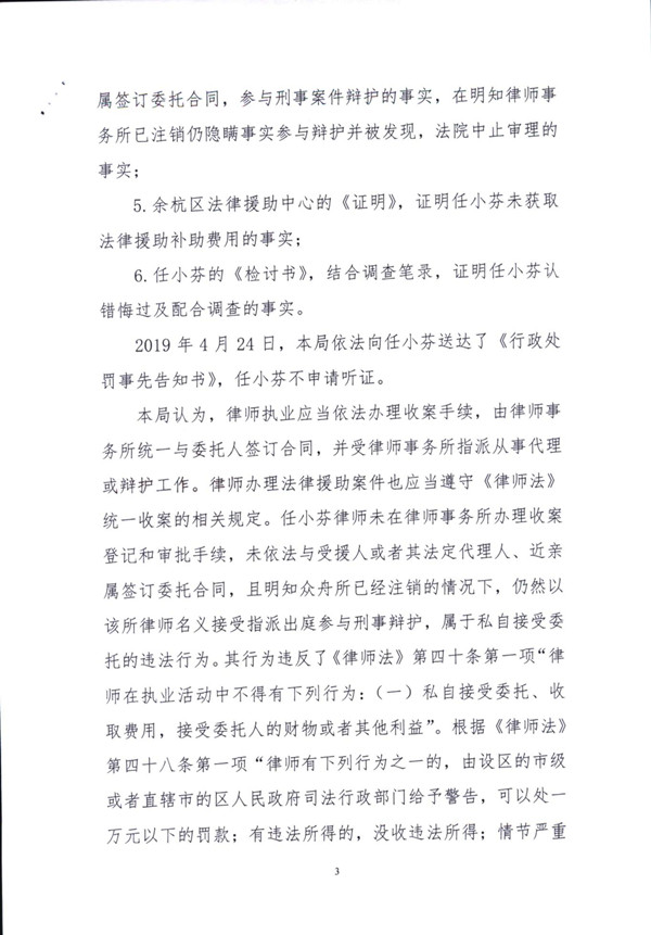 浙江任小芬律师因私自接收委托被处警告并罚款一万元