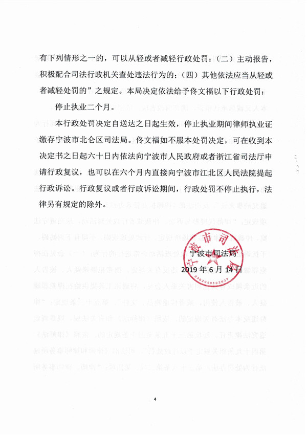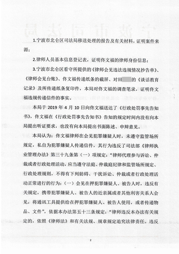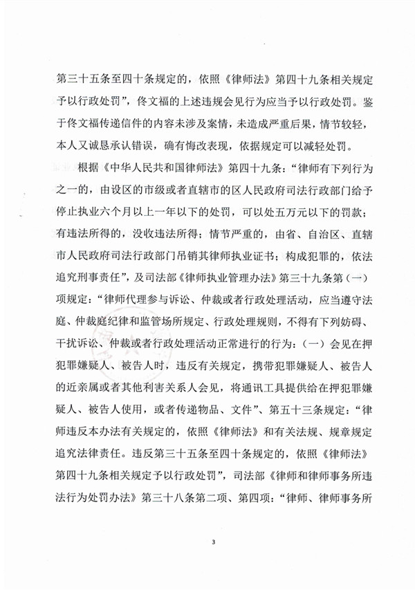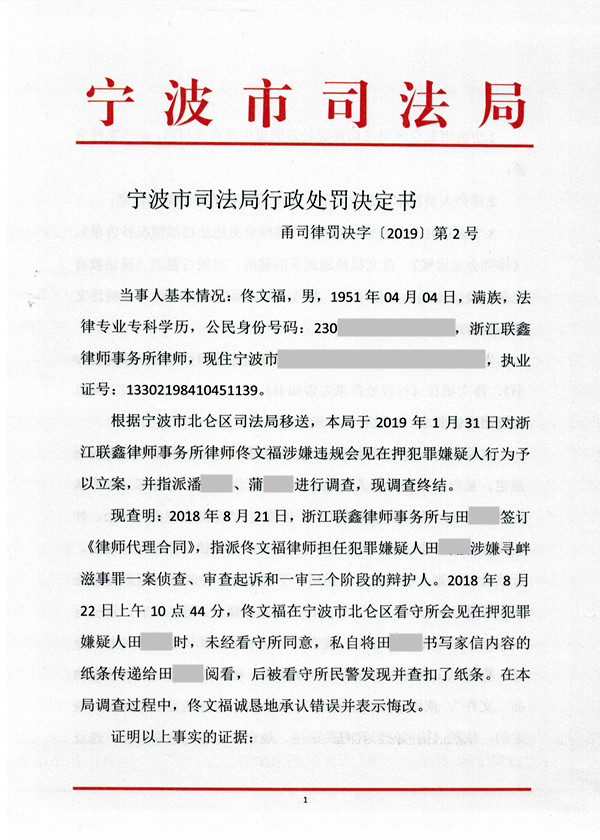 浙江佟文福律师会见时违规传递信件被处停止执业2个月