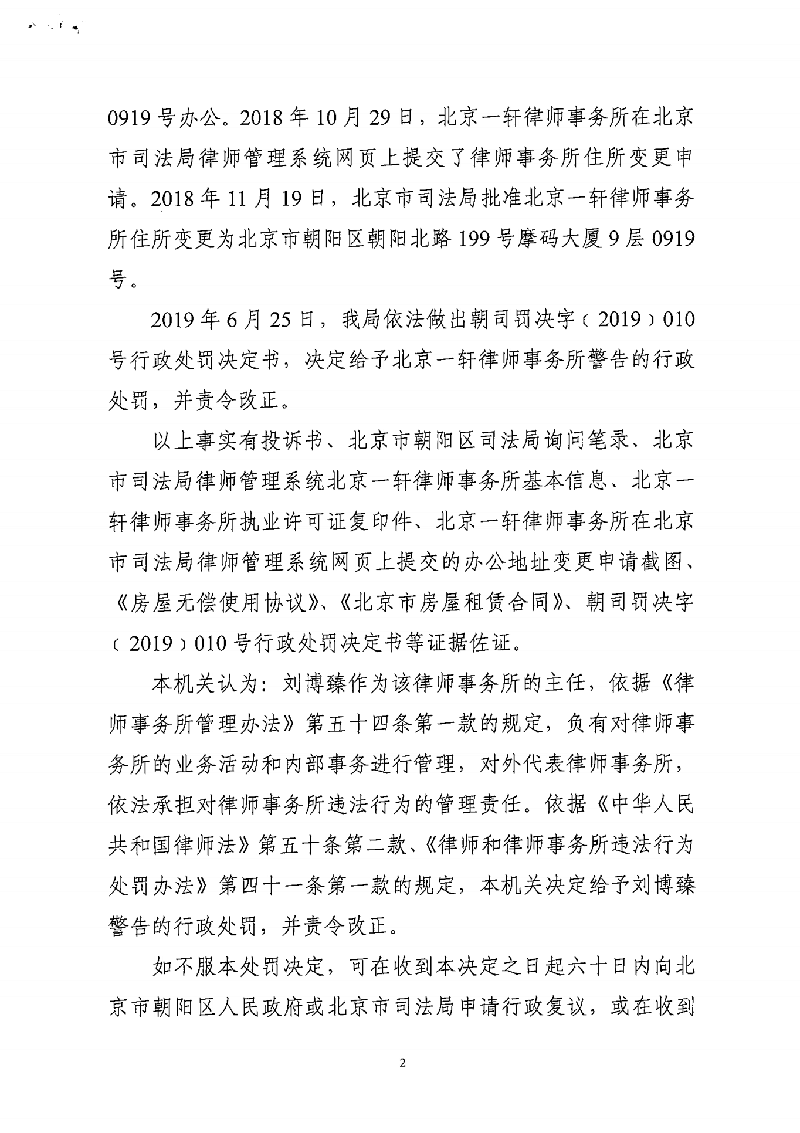 北京一轩律师事务所主任刘博臻因未按法定程序变更律所住所被处警告