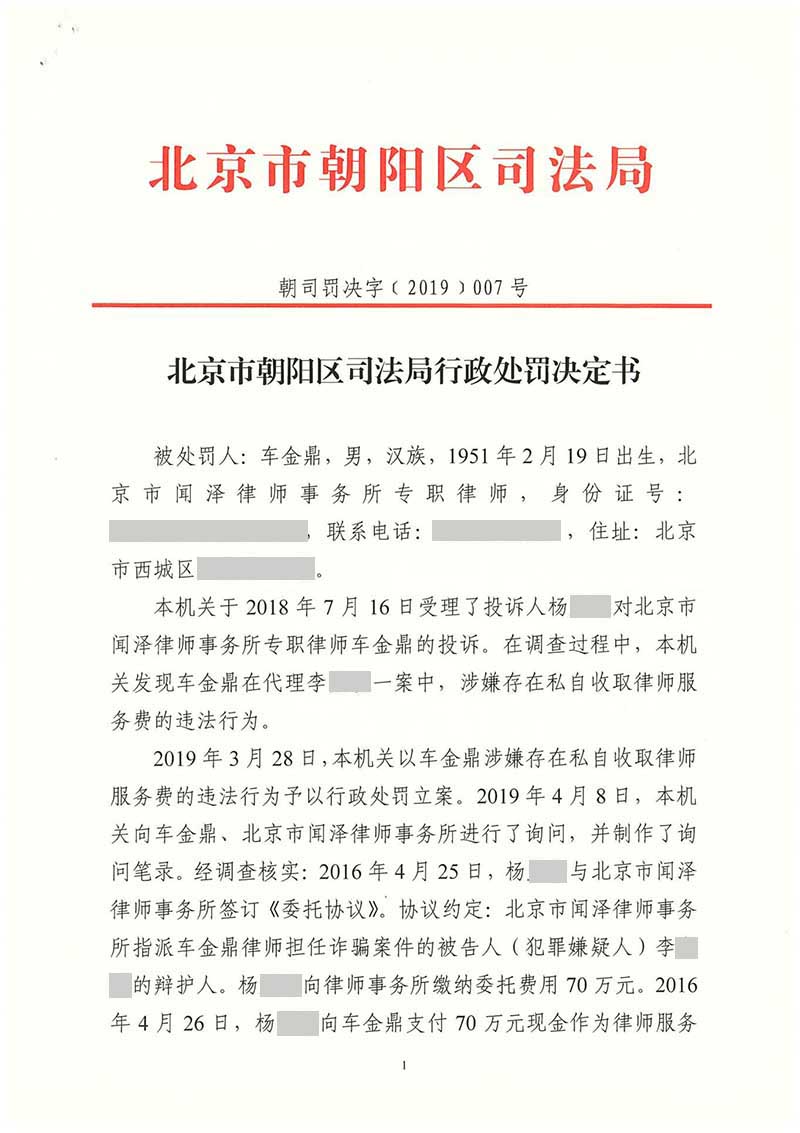 北京律师车金鼎因违反规定私自收取费用被处警告