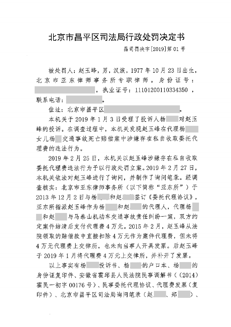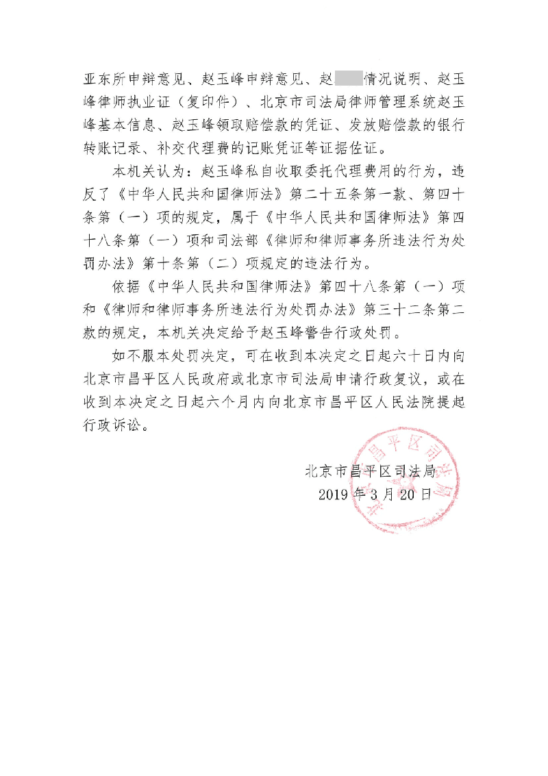北京律师赵玉峰因私自收取委托代理费被处警告