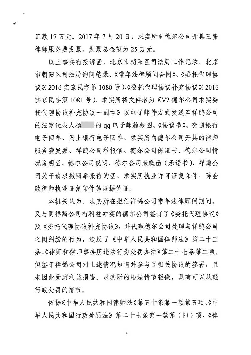 北京市求实律师事务所因违反规定接受有利益冲突的案件被处警告