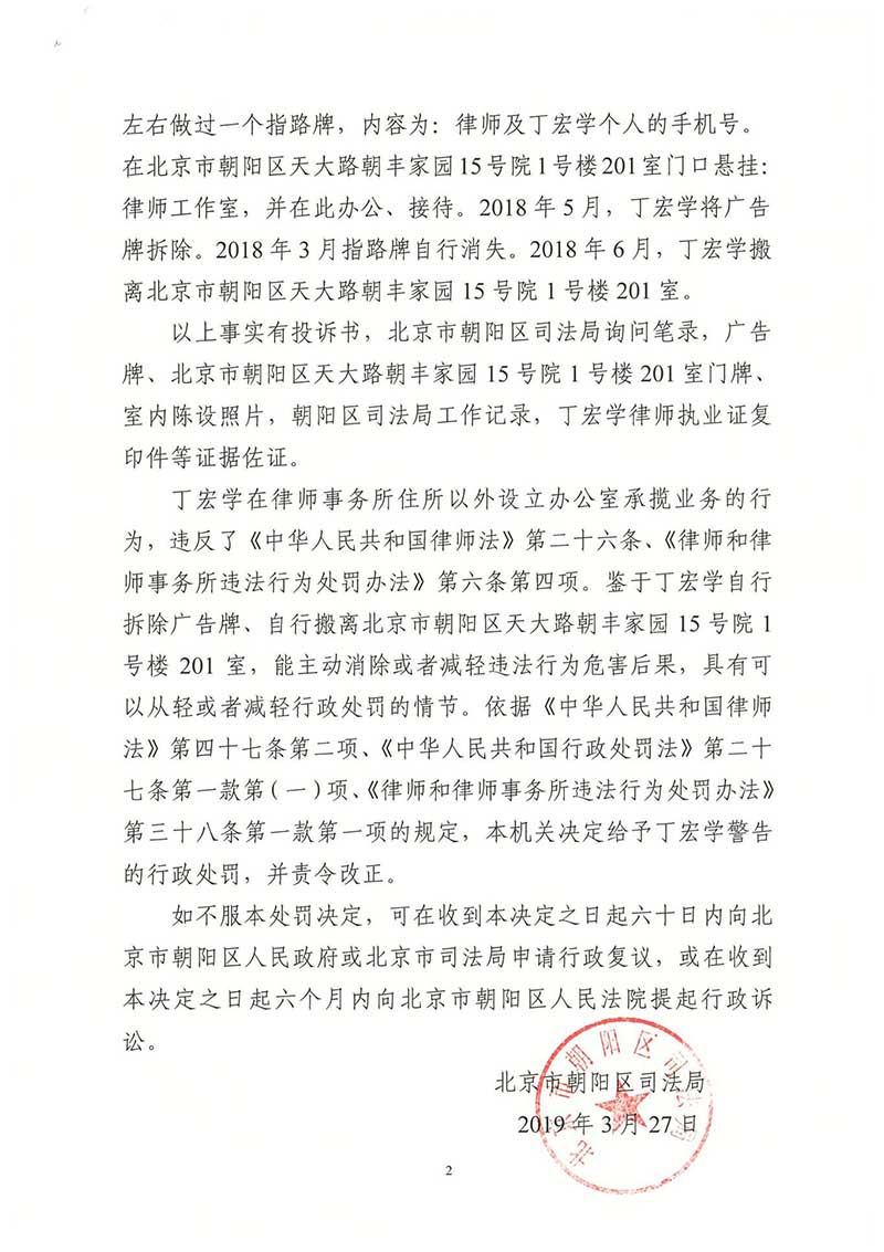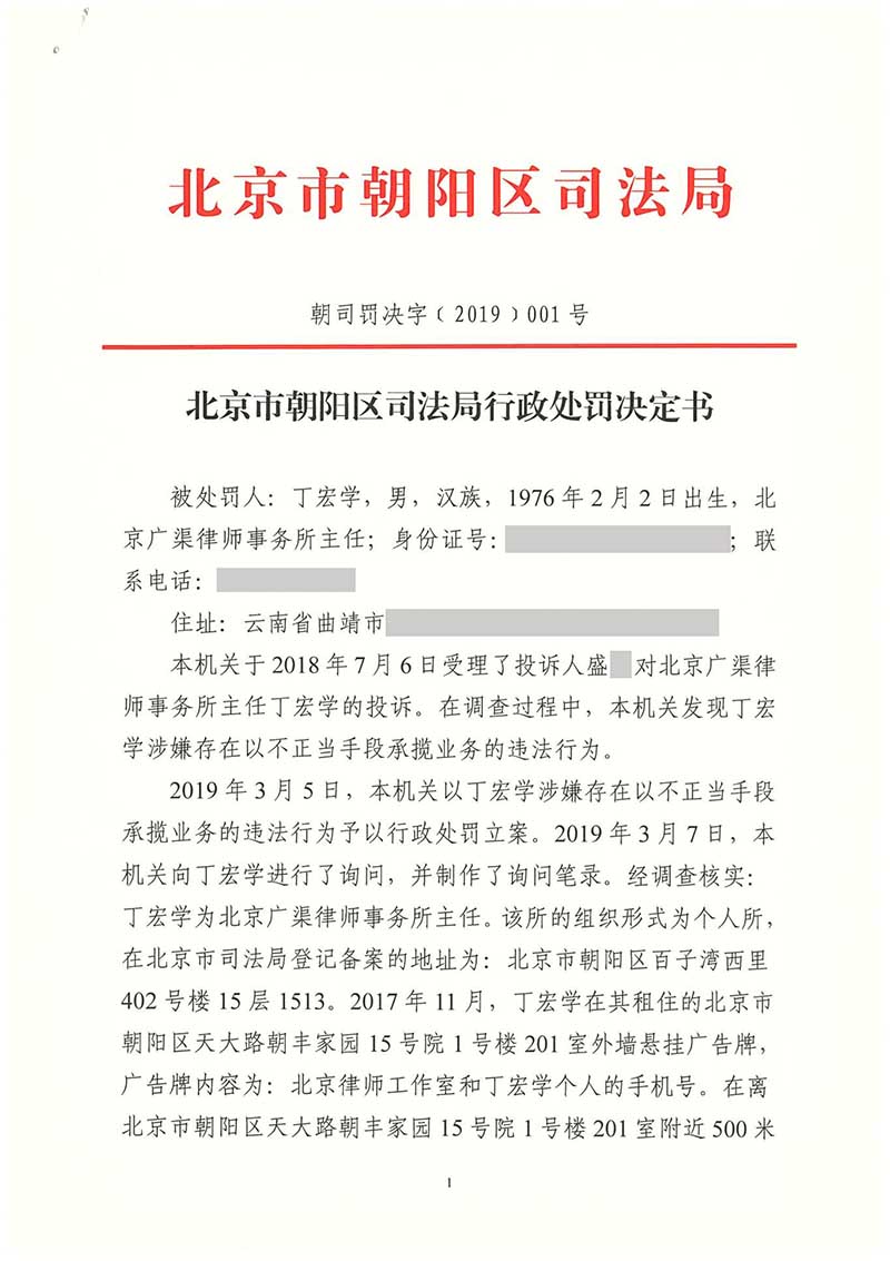 北京广渠律师事务所主任丁宏学因以不正当手段承揽业务被处警告