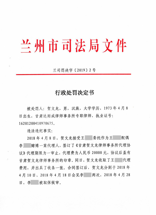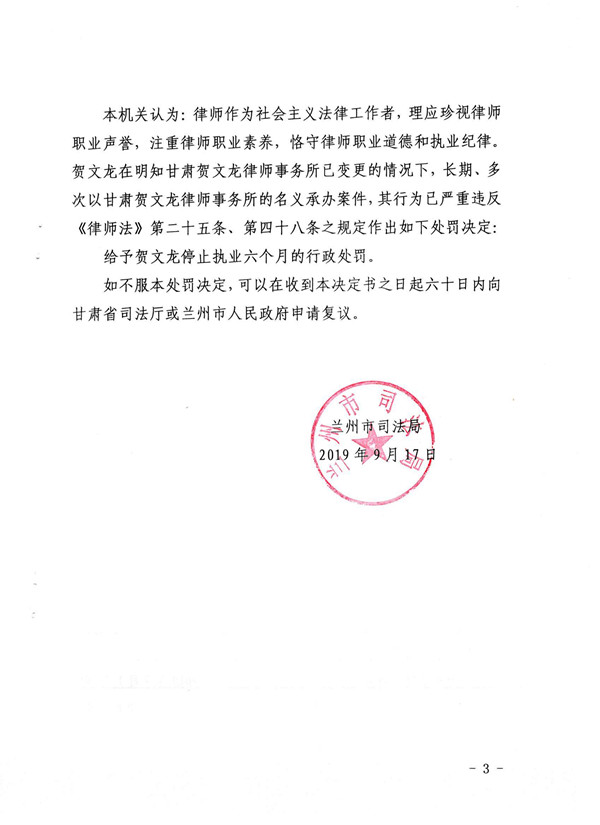 甘肃律师贺文龙明知甘肃贺文龙律师事务所已变更仍以甘肃贺文龙律师事务所名义承办案件,被处停止执业6个月