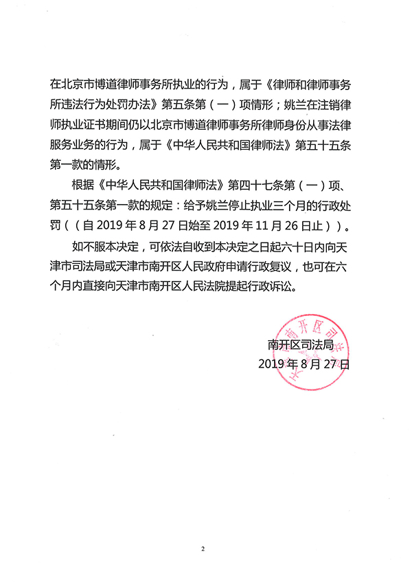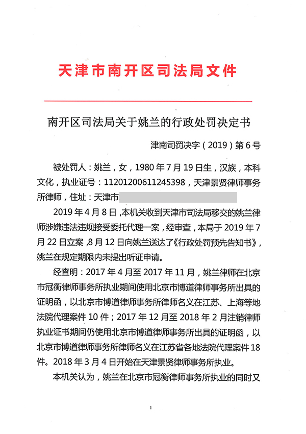 天津律师姚兰因违规接受委托代理被处停止执业3个月