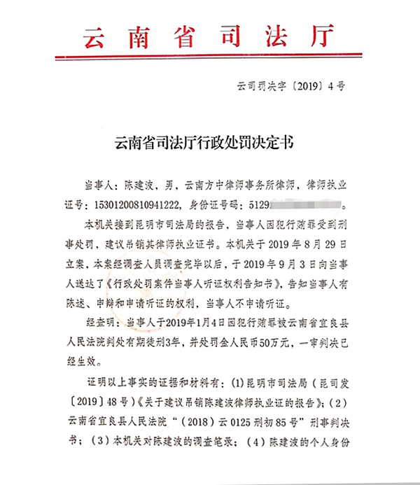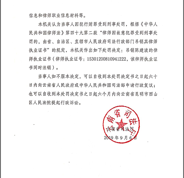 云南律师陈建波因犯行贿罪受到刑事处罚被处吊销律师执业证书