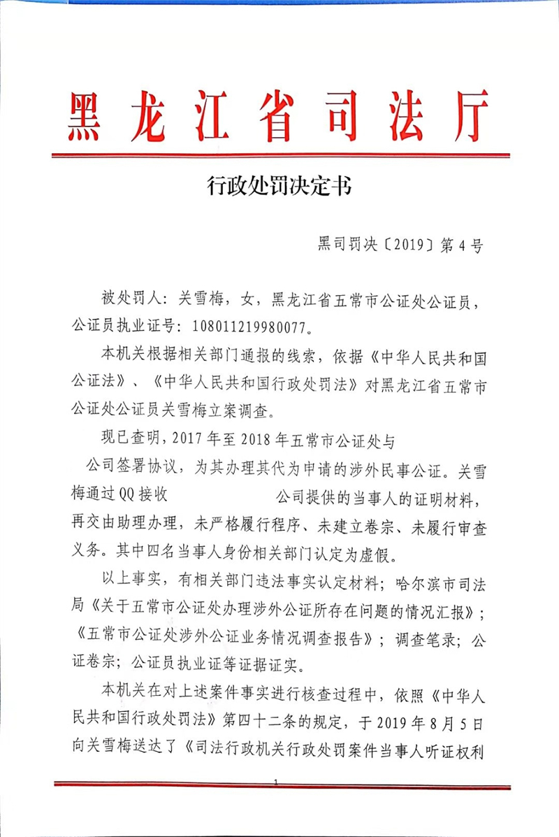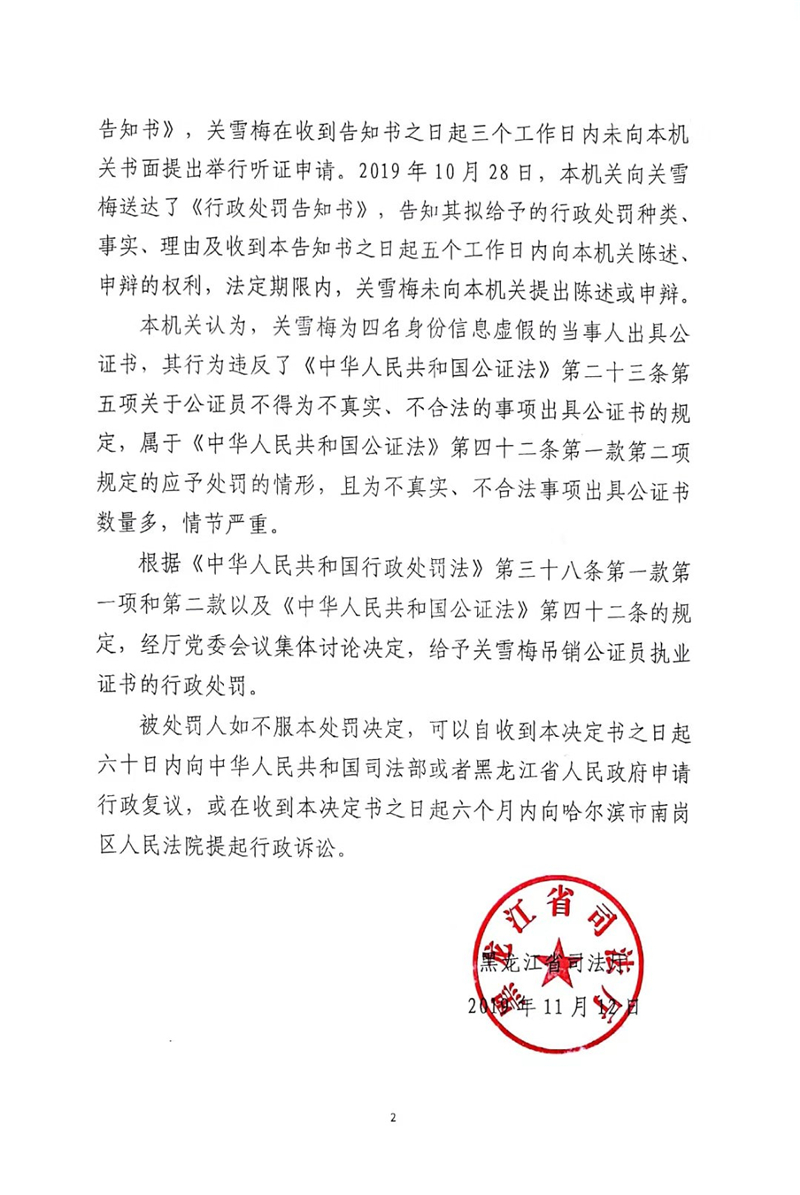 黑龙江公证员关雪梅因为不真实、不合法事项出具公证书受吊销公证员执业证书处罚