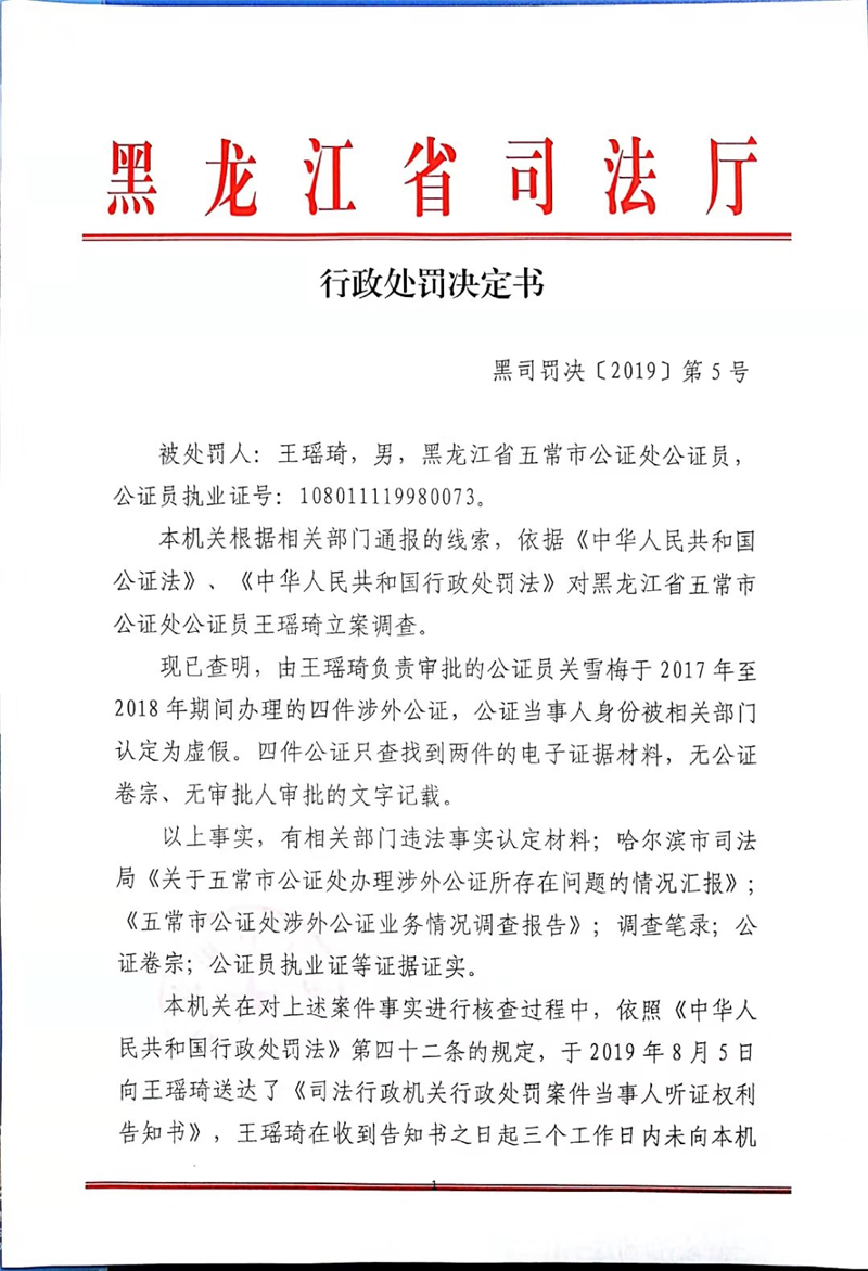 黑龙江公证员王瑶琦因为不真实、不合法事项出具公证书受吊销公证员执业证书处罚
