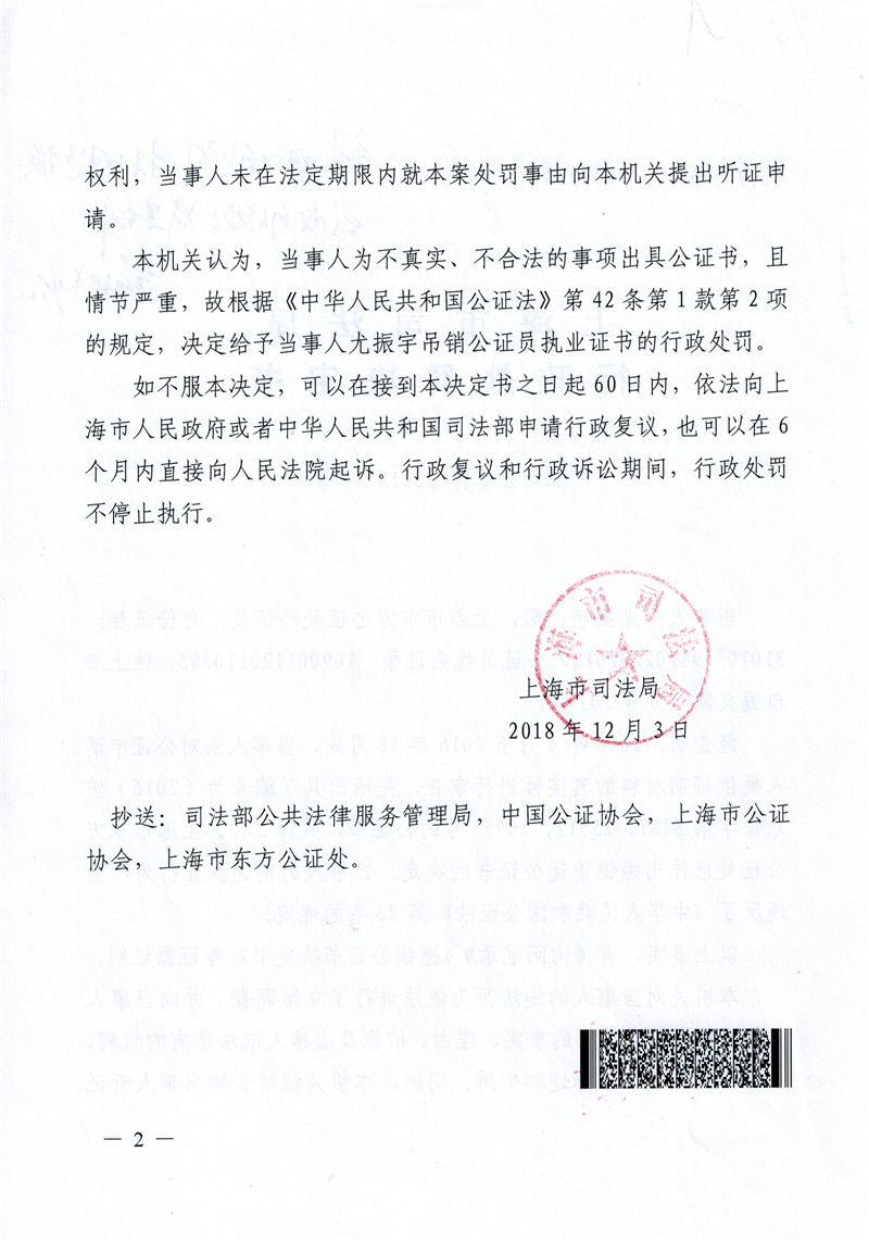 上海公证员尤振宇因为不真实、不合法事项出具公证书(且情节严重)受吊销公证员执业证书处罚