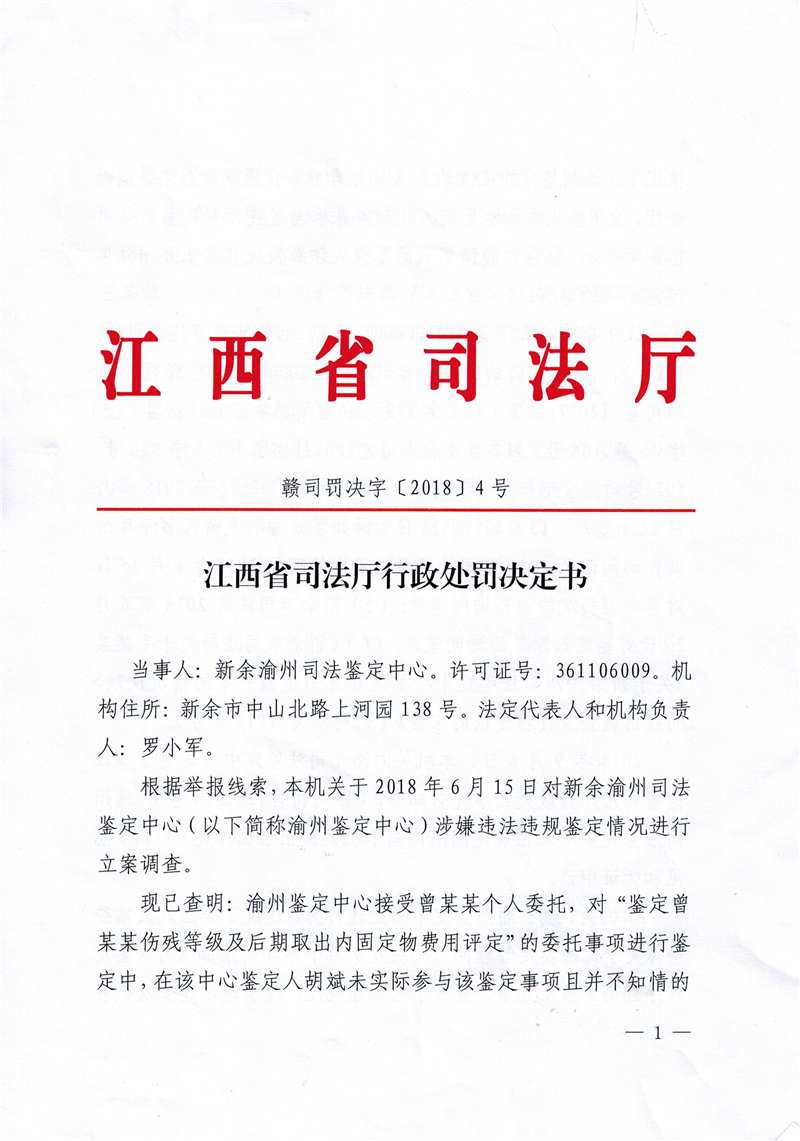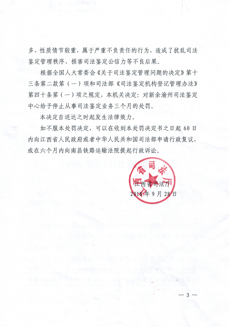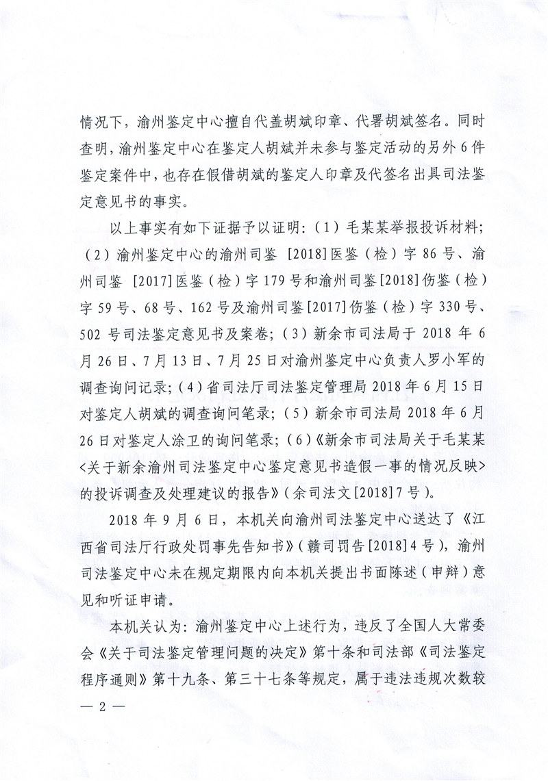 新余渝州司法鉴定中心因代鉴定人签名受停止执业三个月处罚