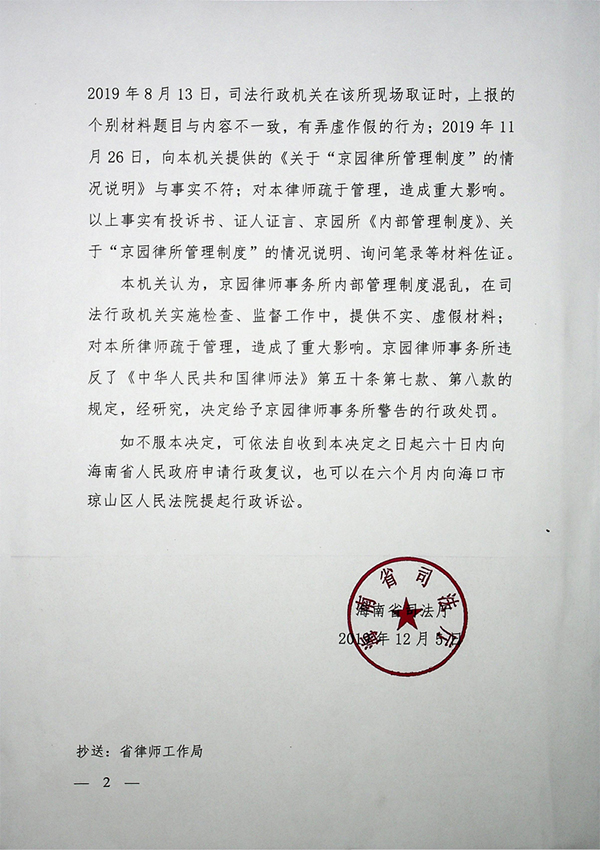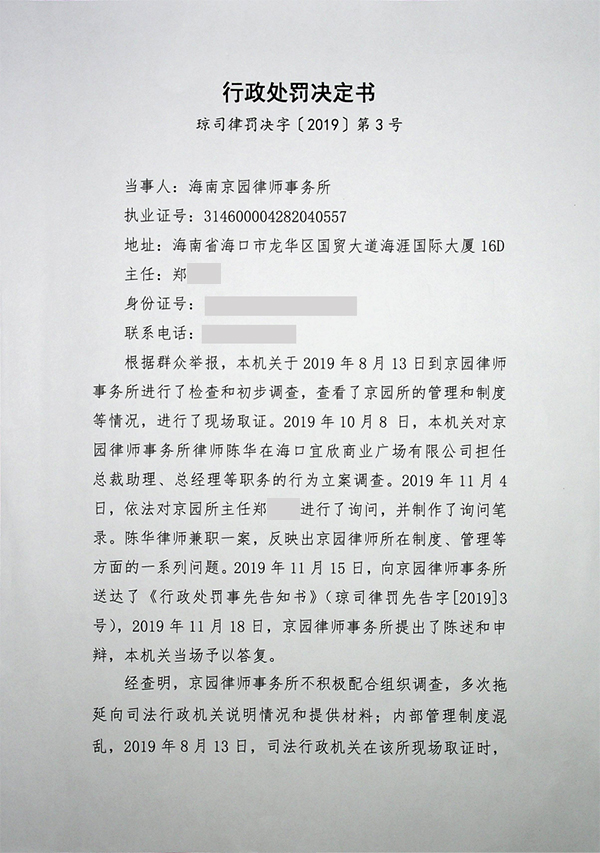 海南京园律师事务所因内部管理制度混乱对本所律师疏于管理等造成重大影响被处警告