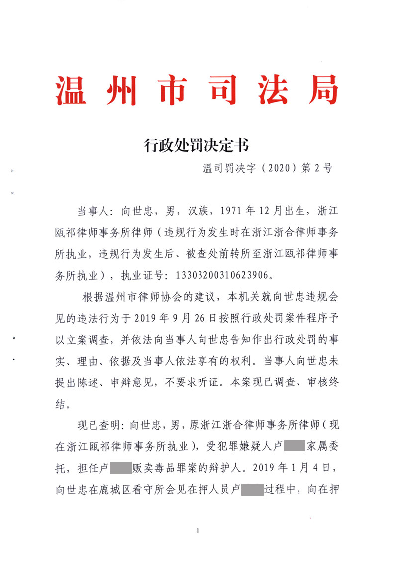 浙江律师向世忠因会见时违规被处停止执业3个月