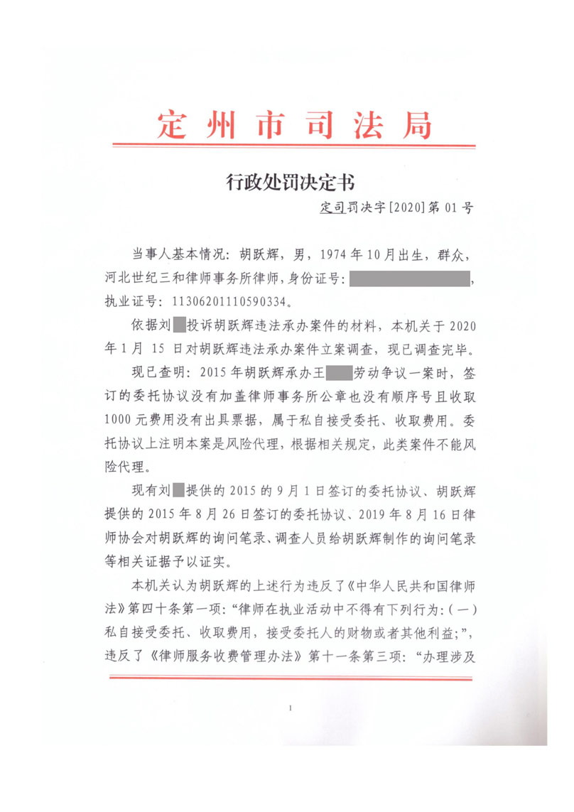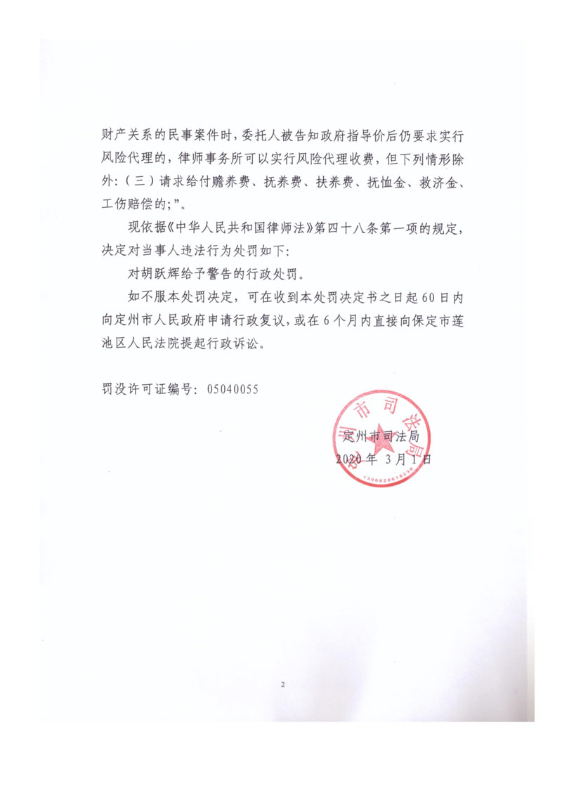 河北律师胡跃辉因私自接受委托、收取费用被处警告