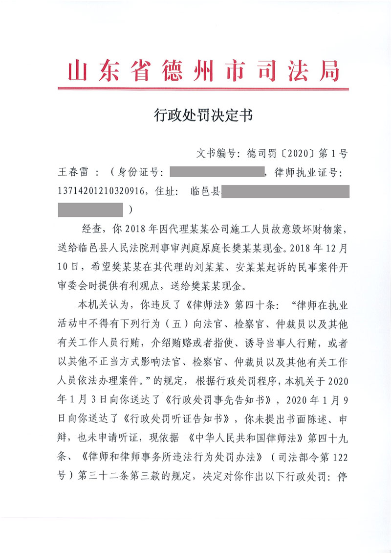 山东律师王春雷因向有关工作人员行贿被处停止执业一年