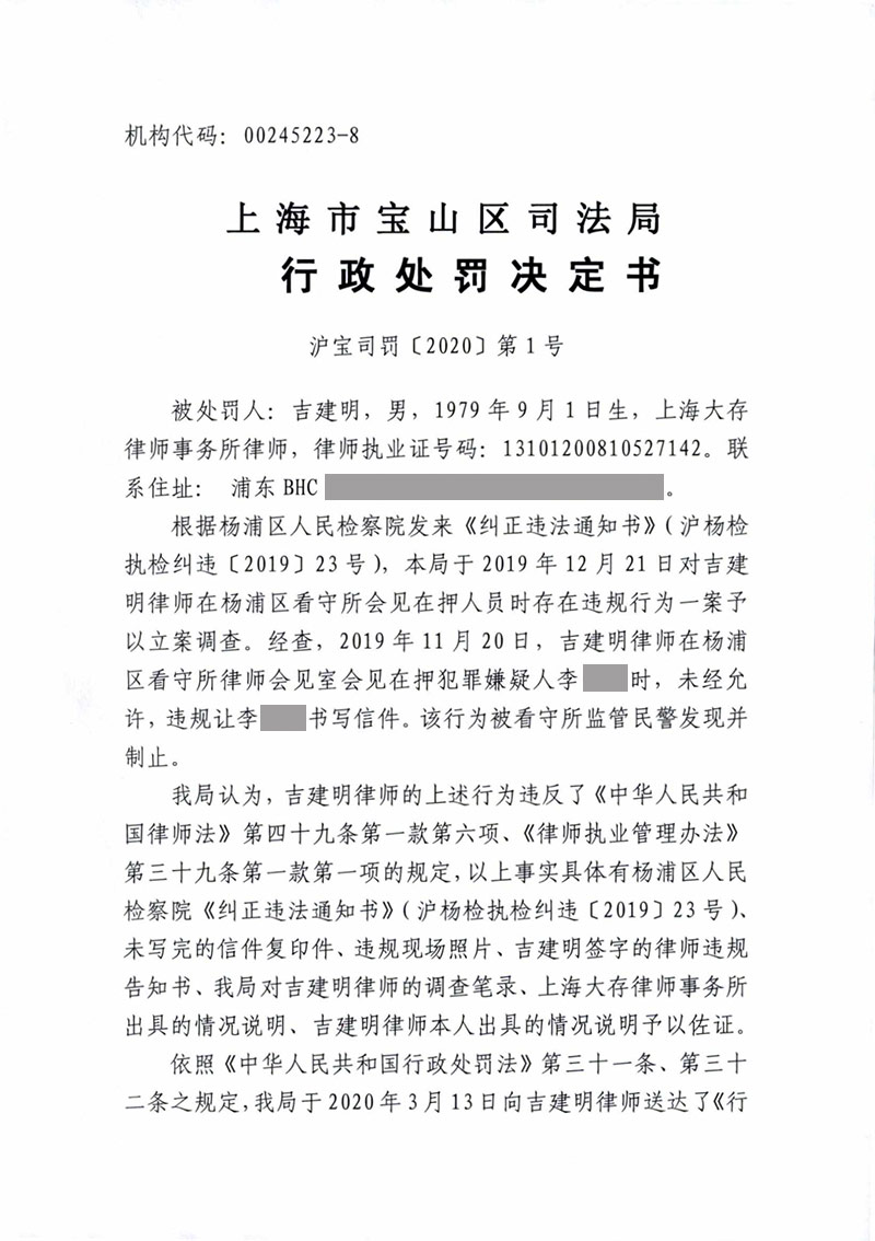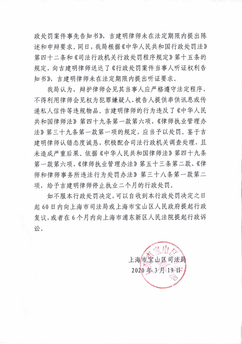 上海律师吉建明因会见在押犯罪嫌疑人时违规被处停止执业2个月