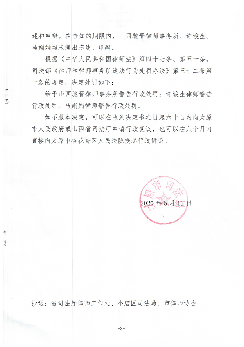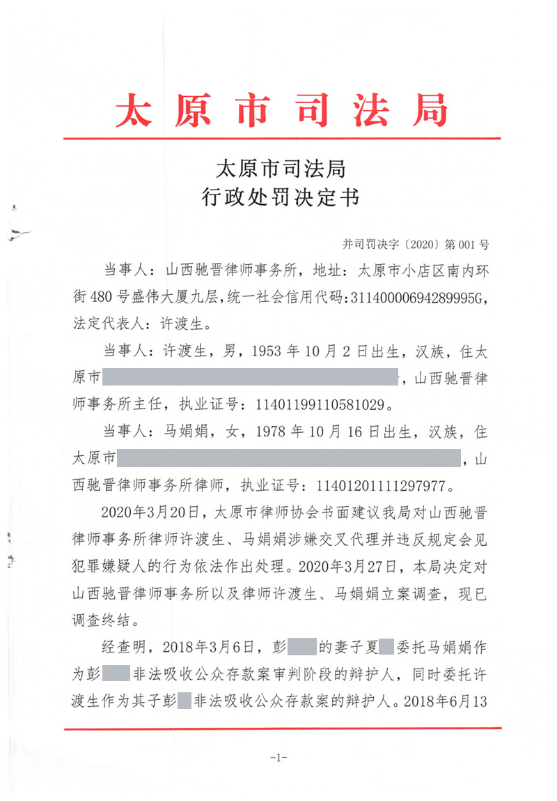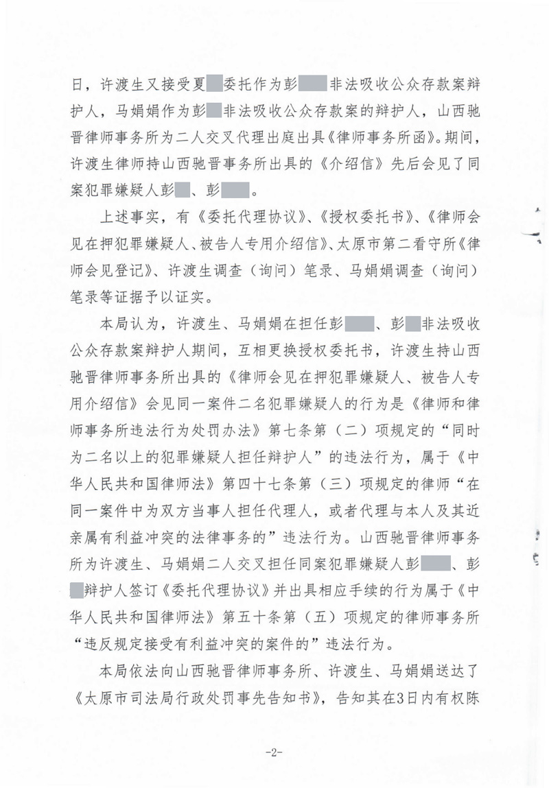山西驰晋律师事务所以及律师许渡生、马娟娟因涉嫌交叉代理并违反规定会见犯罪嫌疑人分别被处警告