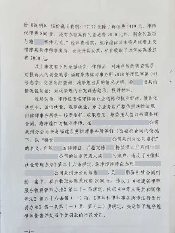 福建律师施净煌因违反规定接受委托私自收取费用等被处警告并处4000元罚款