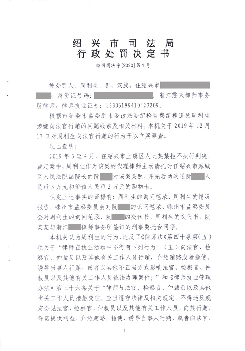 浙江律师周利生因向有关工作人员行贿等被处停止执业一年并处罚款30000元
